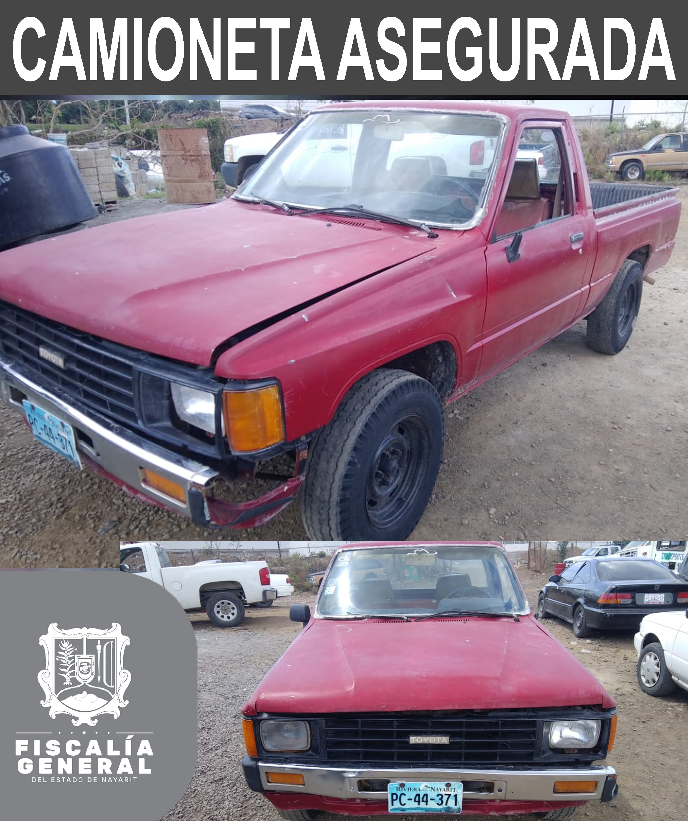 Efectivos de la División de Robo de Vehículos aseguraron una camioneta con reporte de robo, unidad que es de la marca Toyota, tipo Pick Up, modelo 1986, color rojo y con placas de circulación PC-44-371 del estado de Nayarit, la cual quedó a disposic...