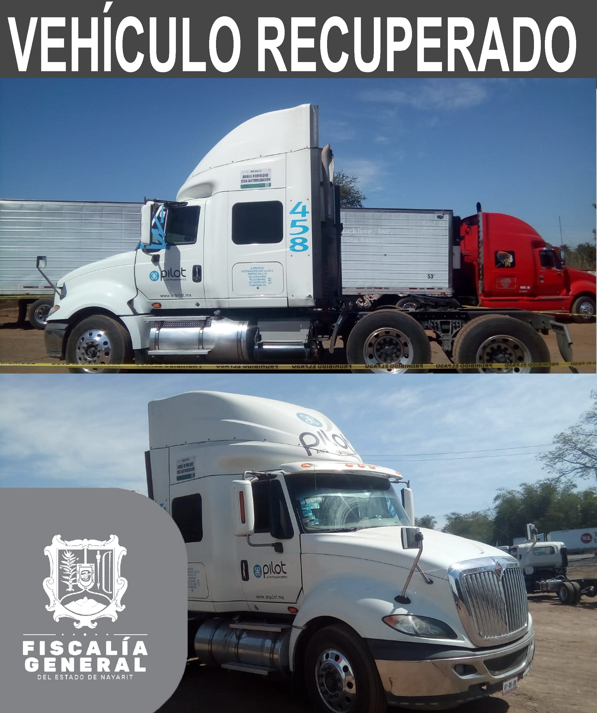 En el crucero del municipio de San Blas, personal de la División de Asaltos Carreteros logró recuperar un tracto camión de la marca International en color blanco, con placas de circulación 87 AK BU del servicio público federal, con número económic...